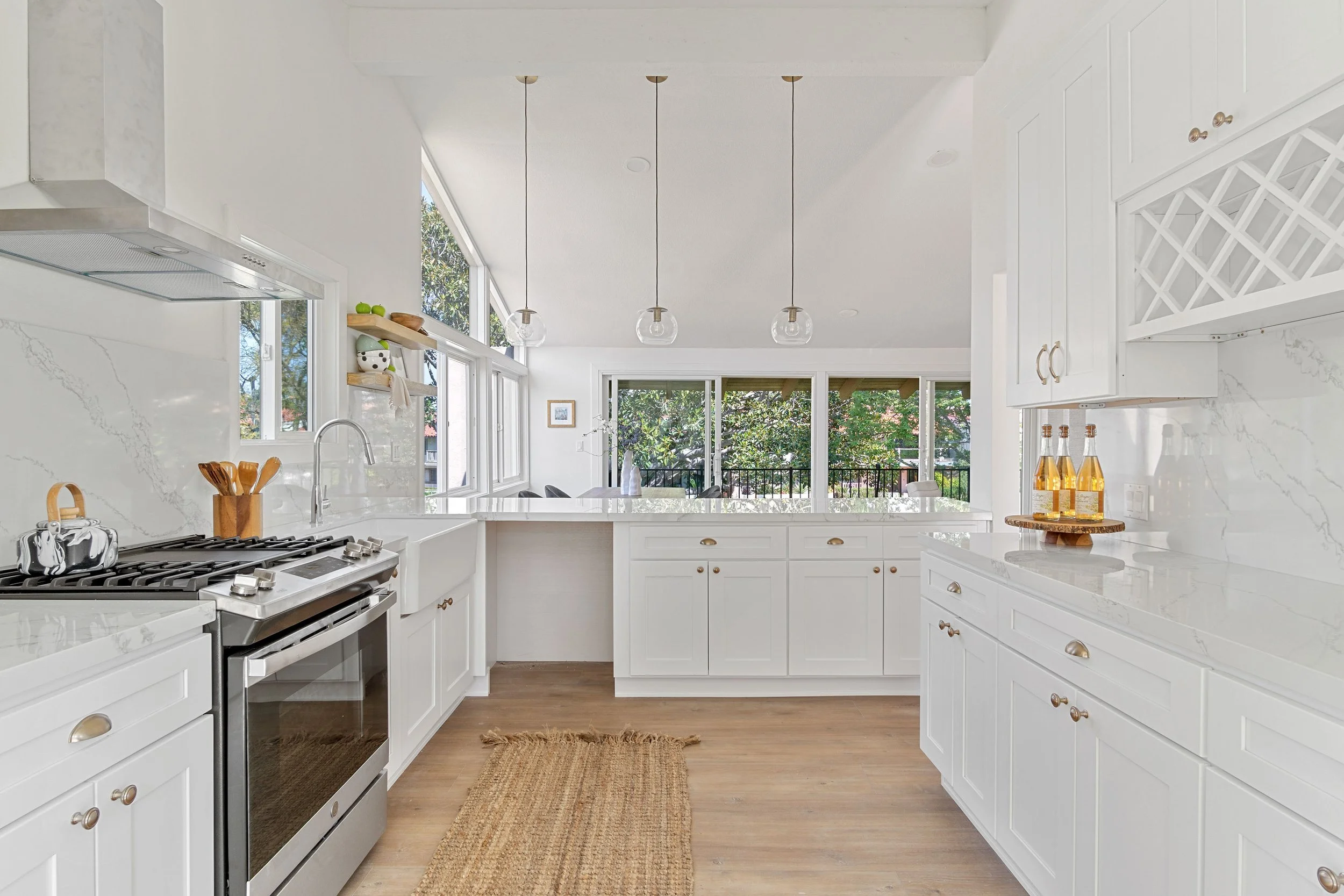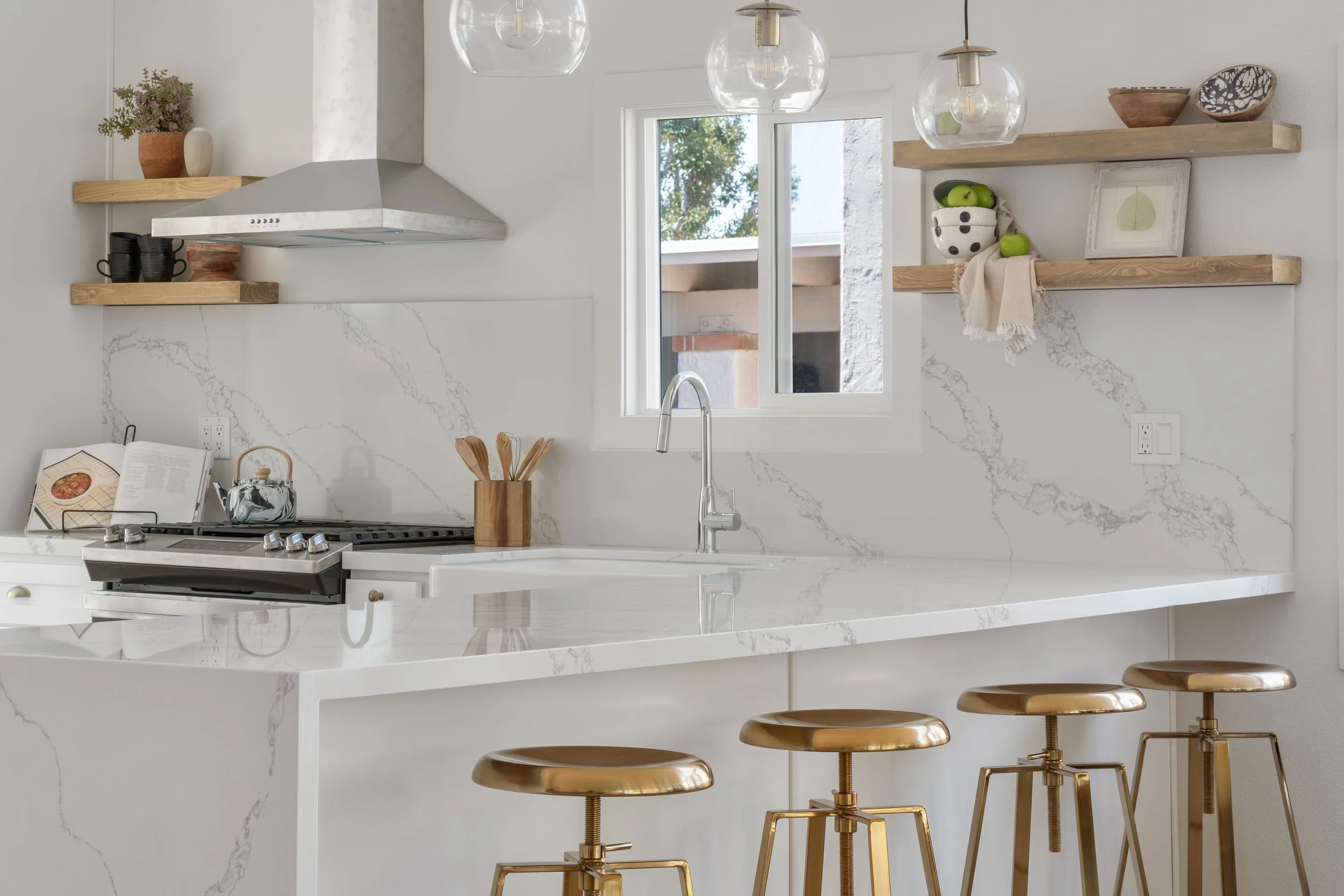The kitchen was redesigned to feel bright and practical. White cabinetry, marble-inspired surfaces, and warm wood accents create balance. Open shelving and simple detailing keep the space clean and intentional. Peninsula seating supports informal dining and everyday gathering, reinforcing the kitchen’s role as the center of the home.
